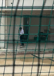 大雨の後、廊下の雨水をふいてくださる職員さん