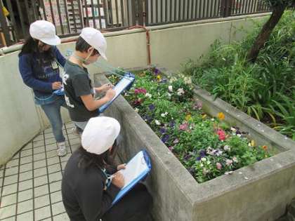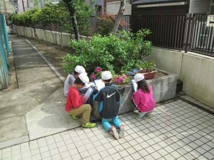校庭にある花を虫めがねを使って観察しました。