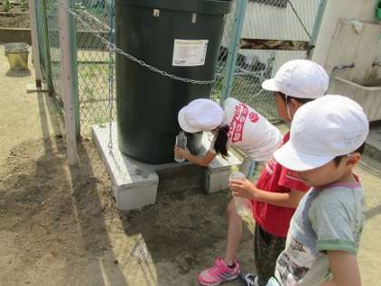 子どもたちは、毎日の水やりや、ザリガニ、金魚、メダカなどの水に使っています。