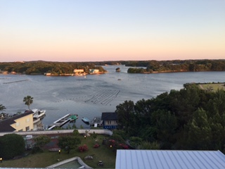 窓からは、穏やかな海と美しく染まりはじめた夕焼けが見えます。