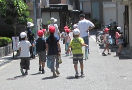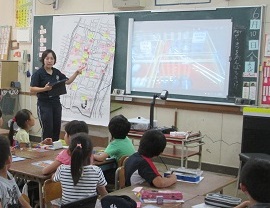 グループで保護者のみなさんのご協力の下、校区を回りながら、発見したものをタブレットのカメラで撮りました。