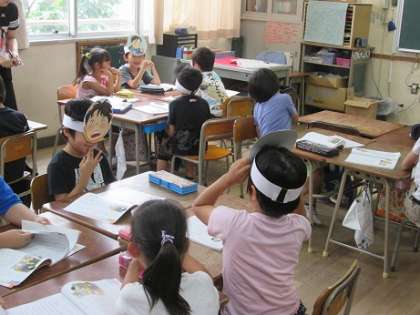 今回はお面をつけて場面を再現する演技をして、登場人物の葛藤を考え、発表し合う活動を取り入れました。