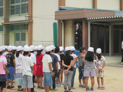 朝礼で、学校長の話でも、この話題に触れ、子どもたちに訓練の趣旨を説明しました。