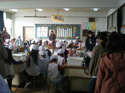 保護者のみなさんの協力をえながら、おいしい茶巾しぼりが完成しました(写真右)。