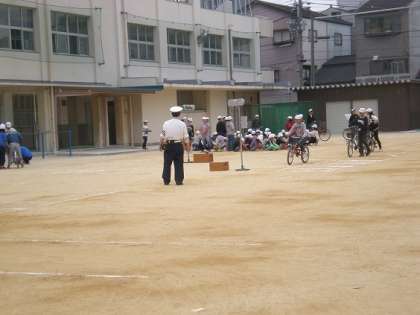 低学年は、交差点の渡り方、中学年・高学年は、自転車での交差点の渡り方について、住之江警察の方に来ていただいて、教えていただきました。