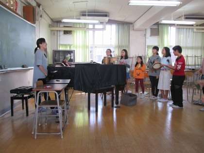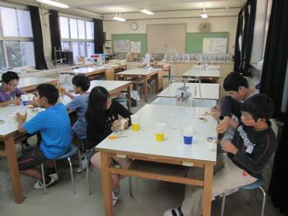 スーパー百マス計算や、歴史人物クイズ作り、ハンドボール、リズム遊び、輪ゴムと紙コップで音階づくりなど、工夫を凝らした授業で、子どもたちは40分の授業を楽しみました。