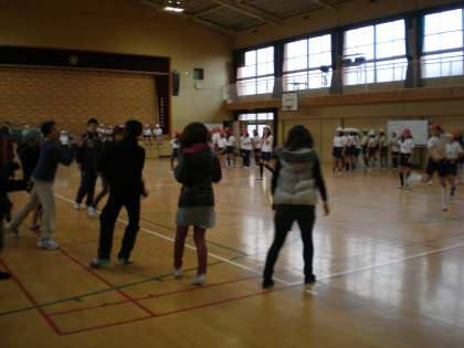 6年生は体育館で。ぽにょぽにょボールでドッジボール大会(写真上)