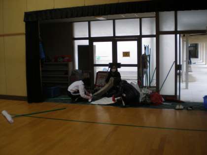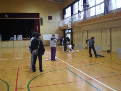 (>。<){体育館のモップをワックスでねちょねちょにしないように、みなさんでバスタオルを用意してくださっていました。