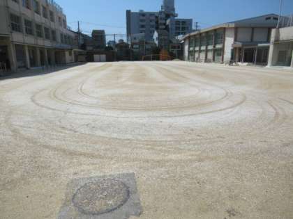 にがりは、運動場の土を適度な硬さに固める働きをします。