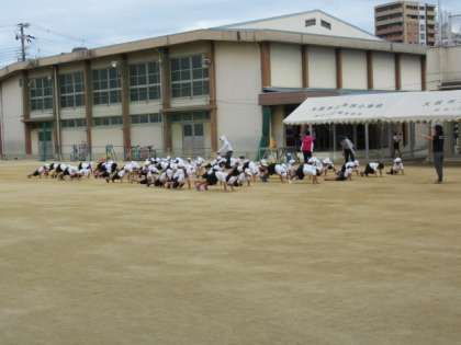 教育委員会の下、一部の演技が制限していますが、更になるべく多くの職員で見守りながら組体操の練習をしています。