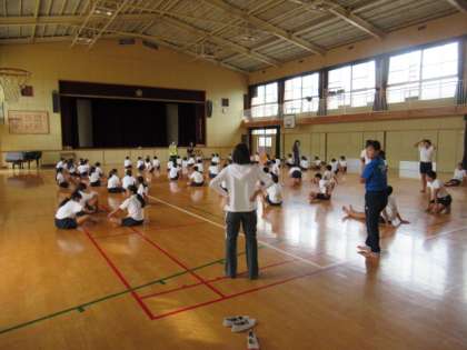 どの学年もテントをはった運動場や講堂で練習を始めています。