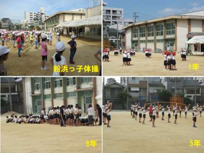 朝の集会は、粉浜っ子体操の練習でした。 その後も、良い天気に恵まれ、各学年、運動会の練習をしました。