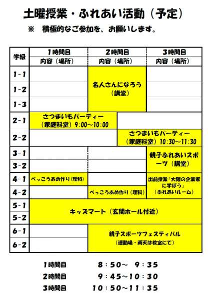 以下の予定表を参考に、参加しやすいよう、上靴・運動靴などのご用意をお願いします。
