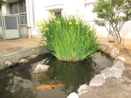正門の横、池のほとりに黄菖蒲が咲いています。