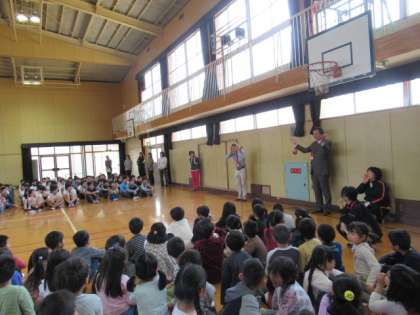 高学年も前に立った1年生も「Good morning」
