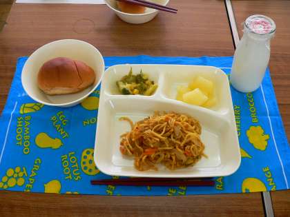 献立は、カレースパゲティー、レタスのサラダ、リンゴの缶詰、牛乳、黒糖パンでした。