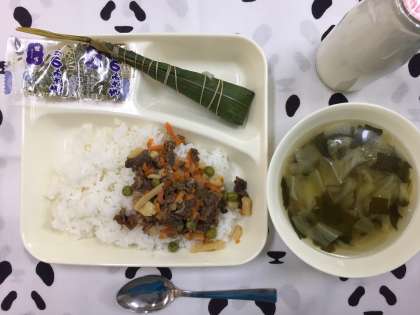 今日の献立は、牛肉のちらしずし、すまし汁、ちまき、牛乳です。