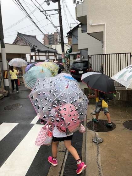 ライドセルに加え、手提げ袋や上靴・下靴・傘などを持って、地区会の教室、そして講堂へ移動しました。