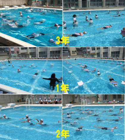 1年生はビート板、2年生は服に空気を入れて、3年生はビート板とペットボトルを浮力体にして仰向きに浮かぶ練習をしました。