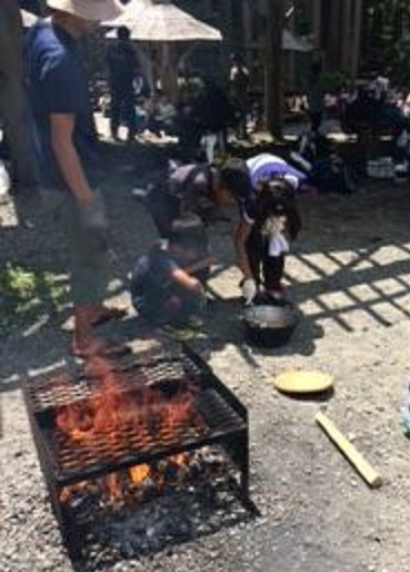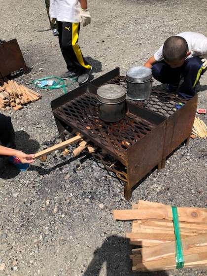 飯盒炊さん火おこしがうまくいっている班、なかなか火がおこらない班があります。