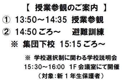 参観終了後、避難訓練・集団下校も行いますので、宜しければ、子どもたちと一緒に帰宅していただけたらと思います。