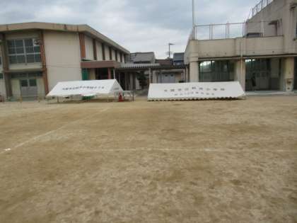 放課後、音楽隊や応援団が練習する中、職員でテントを張りました。