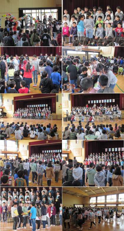 6年生のお礼の合唱や合奏、贈り物(ぞうきん)などがあり、6年生と歌う最後の校歌を歌って、6年生を送り出しました。