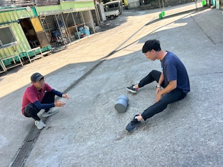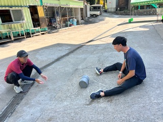 こうやって転がして、氷と塩が混ざるようにして冷やします