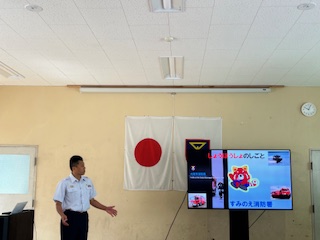 消防署の方から、消防署のしごとについて、動画を観ながら説明していただきました