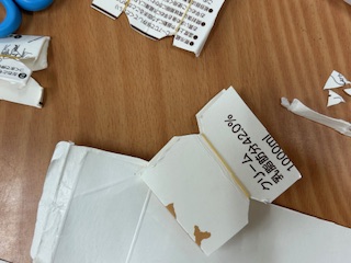 牛乳パックや空き箱、輪ゴムなどでおもちゃを作っていました