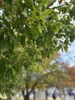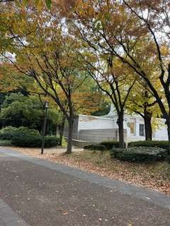 赤や黄色の落ち葉を踏みながら、ピース大阪方面に向かいます