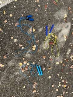 食べ終わった児童が、持ってきたとび縄で、なわとびの自主練をしています!