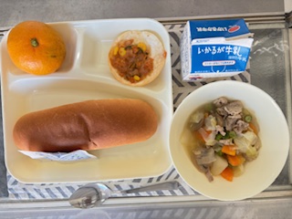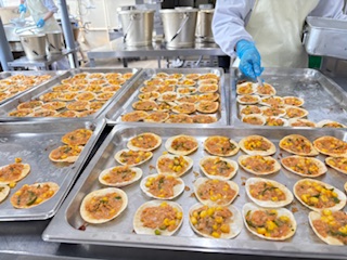 変わりピザは、ツナ、コーン、ピーマン、ピザソース、乳を使用していないチーズを混ぜ合わせて、ぎょうざの皮にのせ、焼き物機で焼きます。児童に好評な献立です。