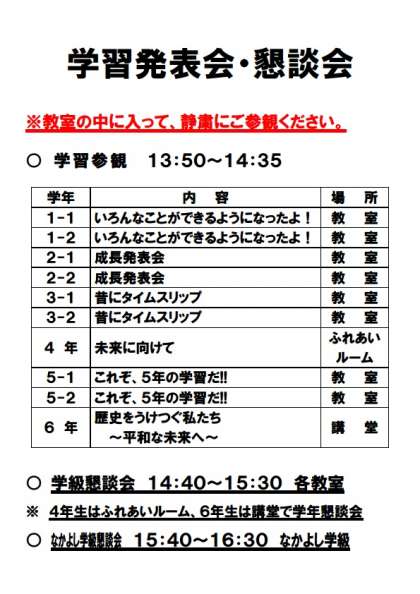 お忙しいとは思いますが、学年最後の参観・懇談会となりますので、よろしくお願いします。