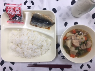 今日の献立は、いわしのしょうがじょうゆかけ、含め煮、いり大豆、牛乳、ごはんです。