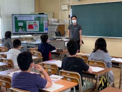 5月26日(火)1年2組は、国語で「く」の練習をしました。はじめに「く」のつくことばを小西先生が聞くと、次々子ども達は発表していました。