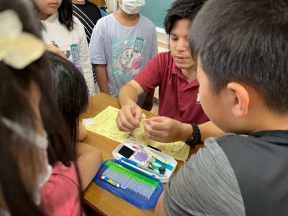 5月31日(水)1時間目、1年生は1組も2組も生活科で「みずで あそぼう」を学習していました。いろいろな容器を使って水でっぽうで遊ぶようです。的をどうするかを考えていました。1組は水にぬれても大丈夫な的を作ろうと考えていました。2組は的をティッシュのようなものでぶら下げて、ティッシュをねらうとおもしろいのじゃないかと考えていました。