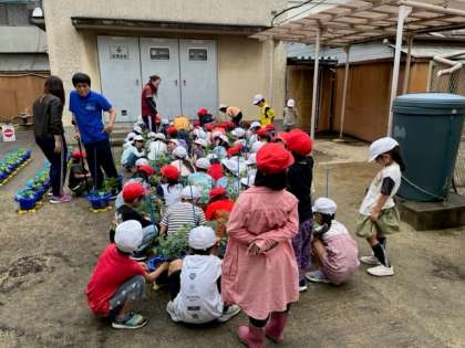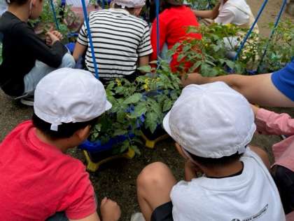 5月31日(水)3時間目、2年生は生活科でミニトマトのわき芽を摘んでいました。わき芽がわからずに、先生に教えてもらう子がいました。