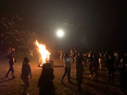キャンプファイヤーでは、各クラスの出し物とレク係のスタンツが楽しかったです。