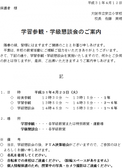 ※ なお、参観・懇談会終了後、本校講堂にて「PTA決算総会」も行います。ご参加のほどをよろしくお願いいたします。