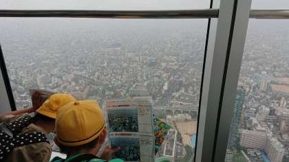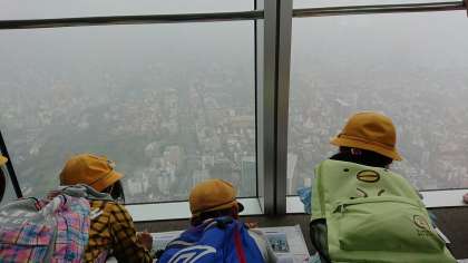 あいにくの天気でしたが、ぼんやりした中にも大阪城や梅田のビル群、大阪湾が見え、鉄道や道路の町の様子について学ぶことができました。