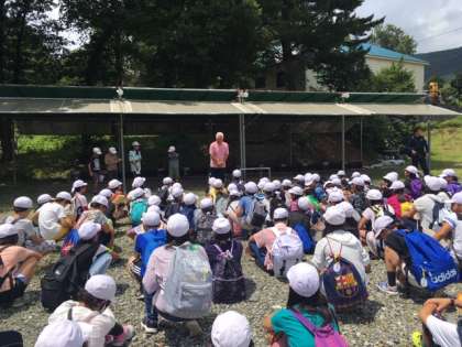 宿舎前の広場で、開校式を行いました。児童代表のあいさつとともに、みんなで「よろしくお願いします」の気持ちを伝えました。宿舎の方からは、ハチ高原についての説明をしていただきました。部屋割りに続き避難訓練をし、いよいよ、ハチ高原での自然体験学校が、本格的にスタートです。