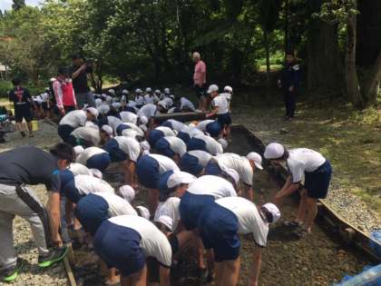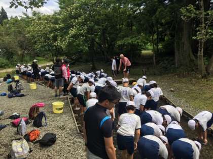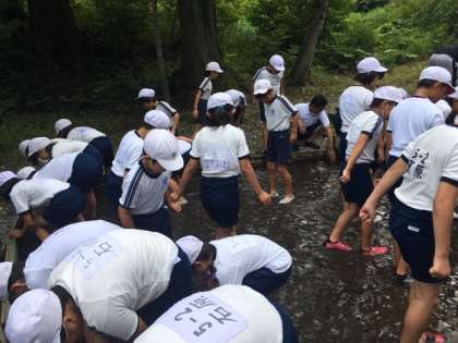 宿舎から300mほど歩いたところに川遊びポイントがあります。くつをはきかえ、せせらぎの中へ。水の冷たさに思わず声をあげながら、魚つかみにチャレンジ。慣れない手つきでつかまえたアマゴと、すてきな笑顔で記念写真を撮りました。