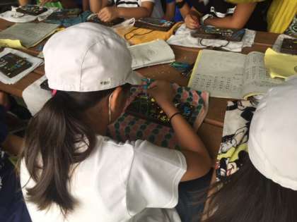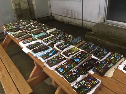 高丸山登山、野外炊さんに続いて、「焼き板工作の仕上げ」に取り組みました。デザインや色彩を工夫しながら、「心を込めた思い出の作品」ができあがりました。