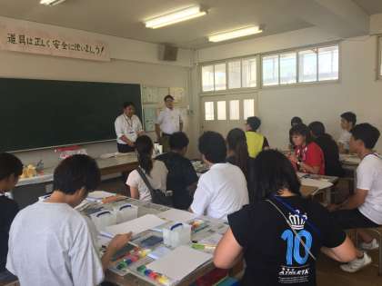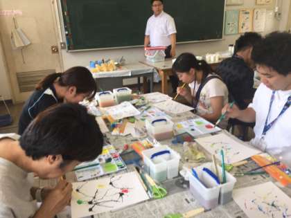 本日、放課後に本校の若手の先生中心の研修会(AYT部会)を実施しました。今回の研修内容は、(株)サクラクレパスさんによる「図画工作科実技研修会」でした。14人の先生たちが、水彩絵の具を使った様々な技法を実際に体験しながら、楽しく研修しました。