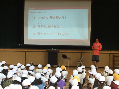 本日、2・3時間目、5年生に、ラグビーチーム「NTTドコモレッドハリケーンズ」の選手の方による「夢・授業」を行いました。2時間目は、体育館でスライドを見ながら「夢をもつことの大切さ」についてお話していただきました。先生の体験したことも交えた内容だったので、大変分かりやすかったです。