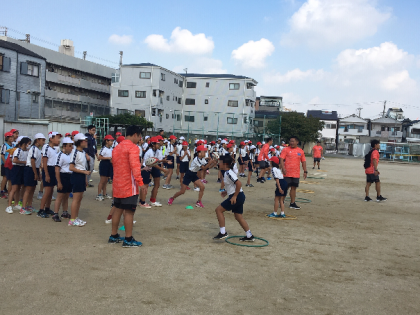 3時間目は、運動場でラグビーを体験しました。ラグビーボール使ったリレーをしたり、選手の方が蹴ったフライをキャッチしたり、ラインアウトのボールをキャッチしたりなどの活動を通して、ラグビーの楽しさをたっぷりと味わいました。