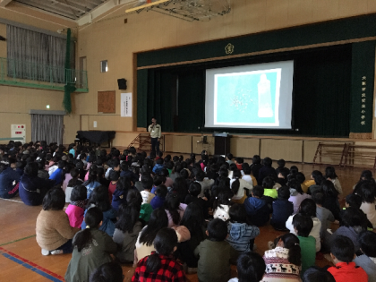 本日、創立110周年記念講演会の第2弾として、天王寺動物園より動物専門員の井出貴彦様に来ていただき、1・2・3年生の子ども達にお話をしていただきました。「動物のエサとウンチ」という興味深いテーマで話していただきました。色々な動物のたくさんのウンチを写真で見ながら、楽しく説明してくださいました。子ども達も、最後まで関心をもちながら、お話を聞くことができました。