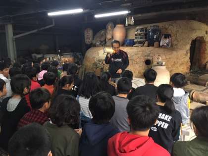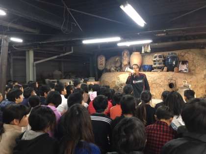 昭和9年につくられた登り窯をバックに、信楽焼きについての説明をしていただきました。NHK朝の連続テレビ小説「スカーレット」も、話題です。