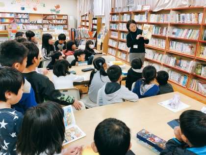 安立小学校では各学年、週に1回、国語科で図書の時間を設定し、読書好きの子どもたちを育てています。下の写真は、図書館支援員の梶さんが読み聞かせをしているところです。目を輝かせて聞いている子どもたちの様子をご覧ください。